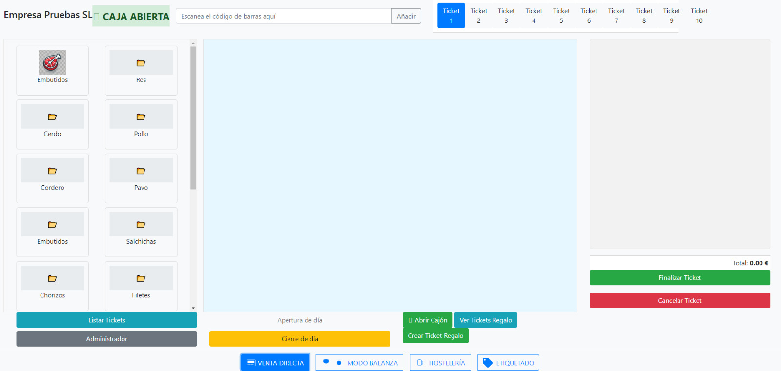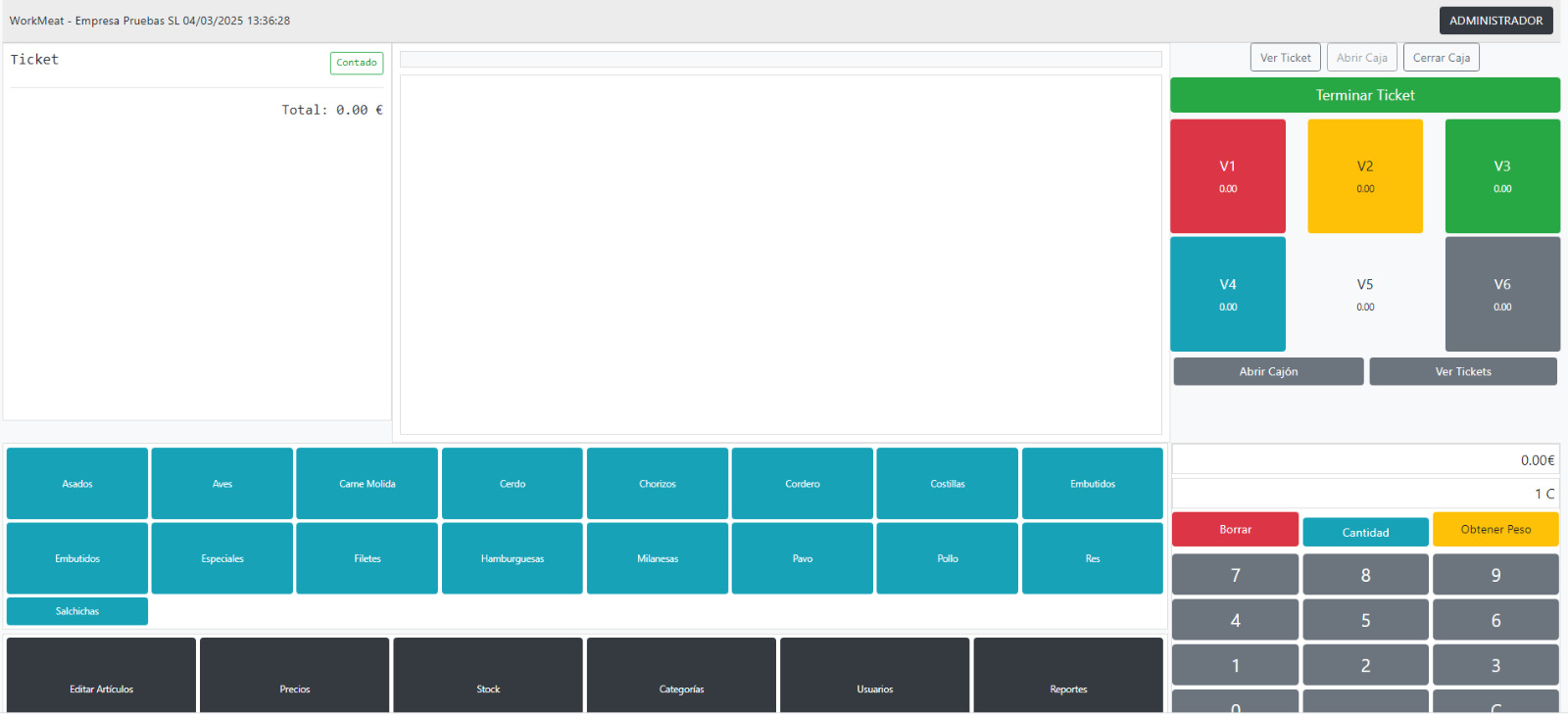 ✔ Pantalla de venta adaptada a mostradores de carnicería, con acceso directo a productos y precios.